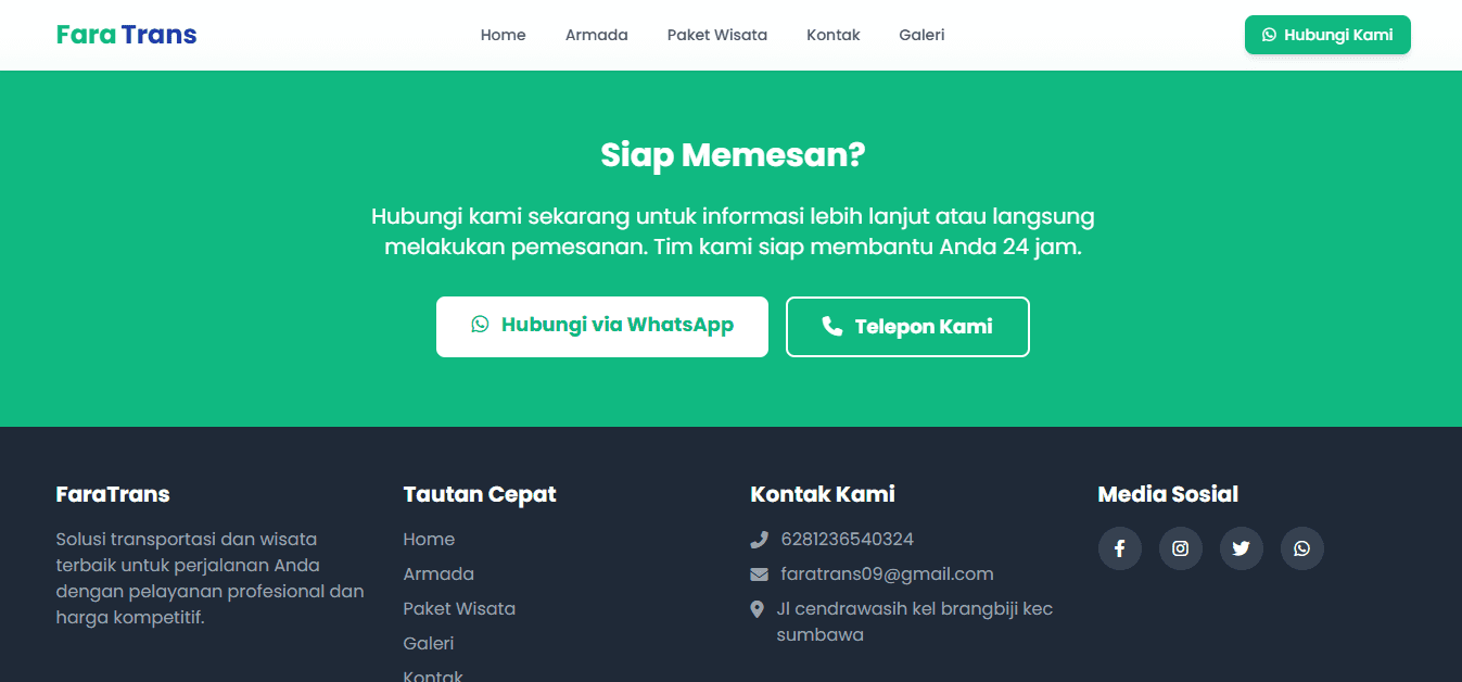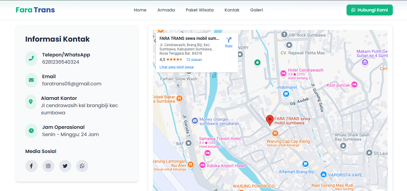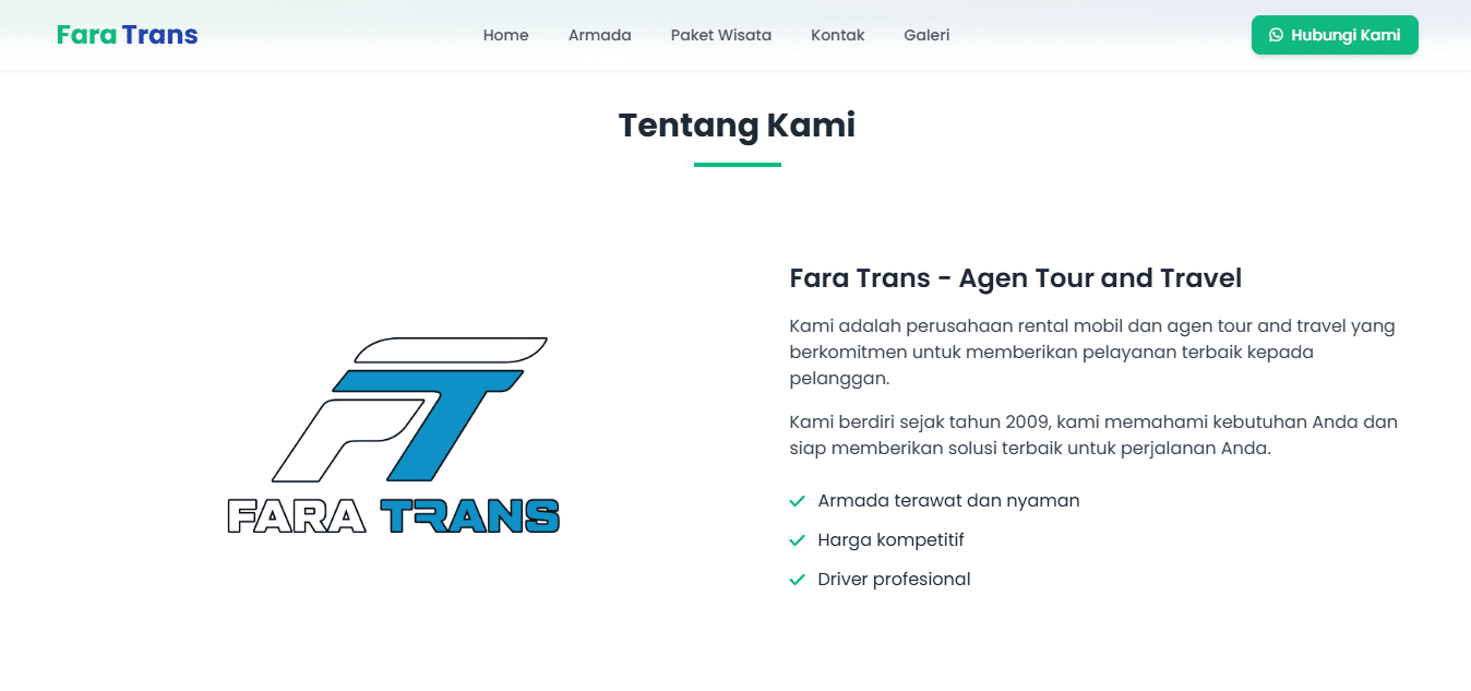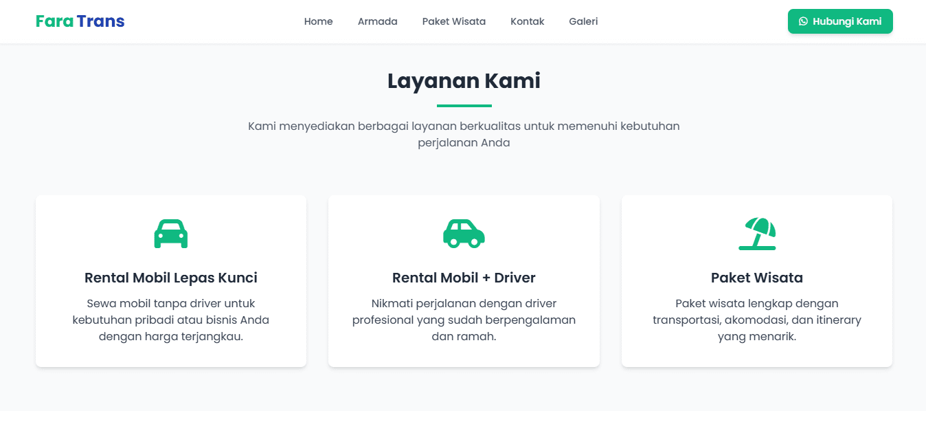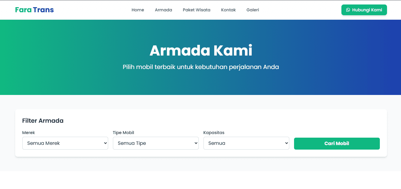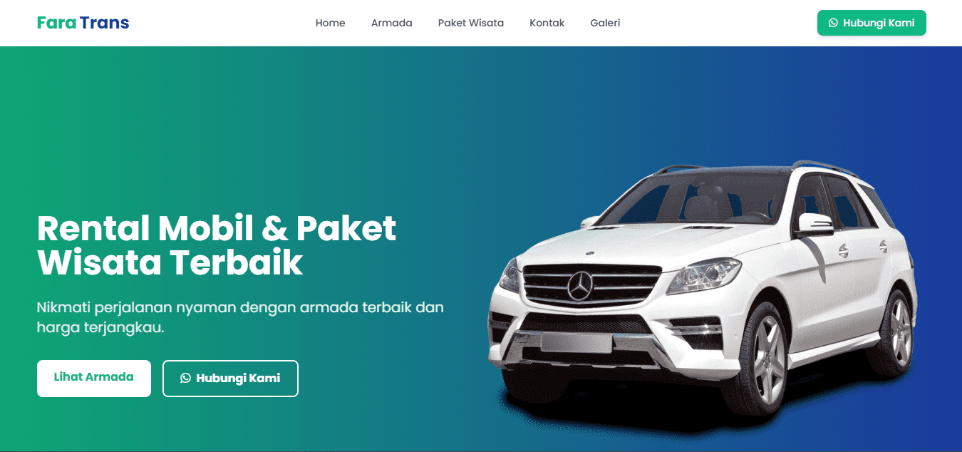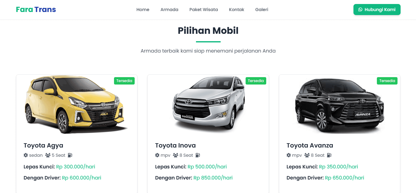 Fara Trans is a trusted car rental service based in Sumbawa, offering a range of comfortable and well-maintained vehicles for daily use, business trips, and tourism. Through this website, users can explore available Armada, discover exciting Tour Packages to popular destinations in Sumbawa, and browse travel moments in the Gallery. The Contact page makes it easy to book or ask questions, while the Home page provides an overview of our services. Fara Trans is your reliable travel partner, delivering professional service at affordable prices.